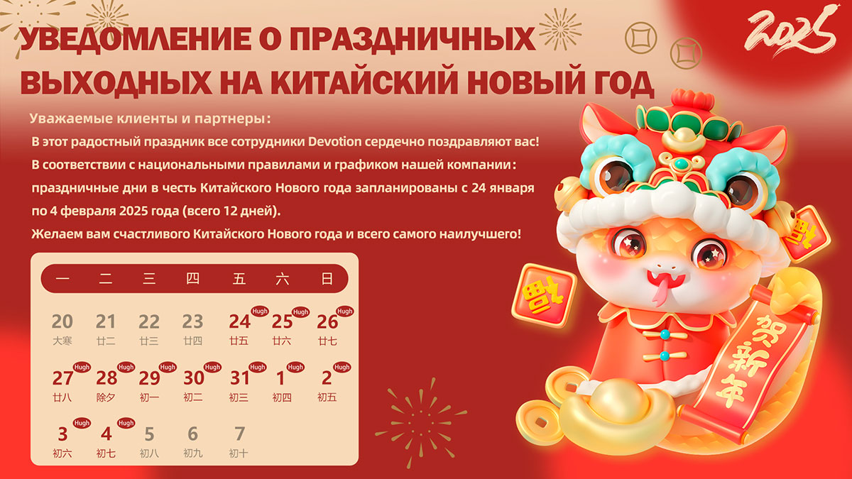 Благодарим вас за вашу постоянную поддержку и доверие к Devotion Equipment! В преддверии традиционного Китайского Нового года все сотрудники нашей компании также готовятся к ежегодному отпуску. Devotion Equipment будет находиться на новогодних каникулах с 24 января по 4 февраля 2025 года, всего 12 дней.