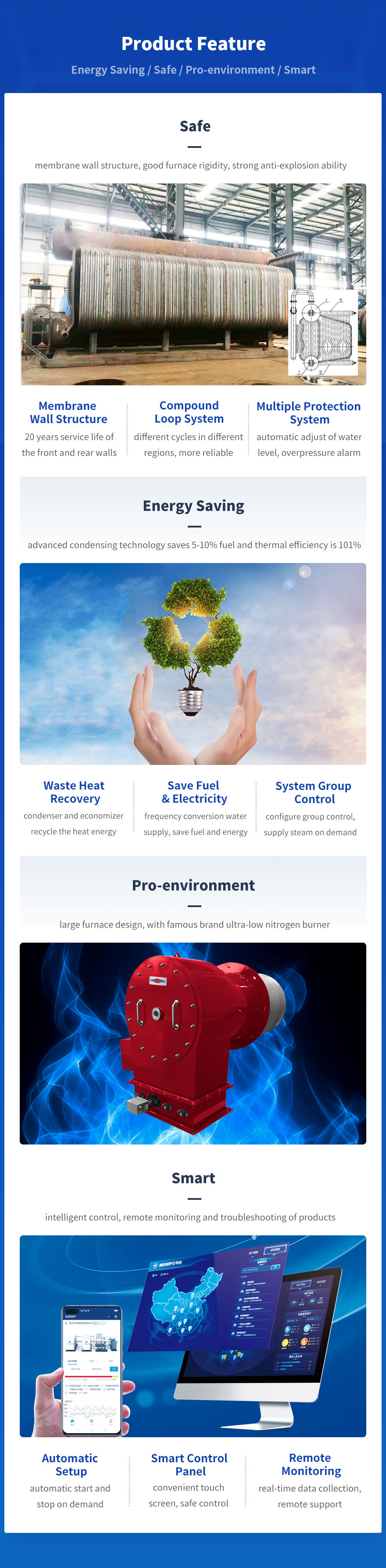 Водотрубный водогрейный котел Devotion СЗС имеет двойной барабан D-типа, продольную конструкцию, с топкой справа и пучком конвекционных труб слева. Печь окружена мембранными стенками с водяным охлаждением. Это безопасно и надежно, не Легко взрывается и имеет встроенный независимый энергосберегающий конденсатор.Конденсатор может эффективно снизить температуру выхлопных газов, значительно повысить эффективность котла, является энергосберегающим и эффективным.